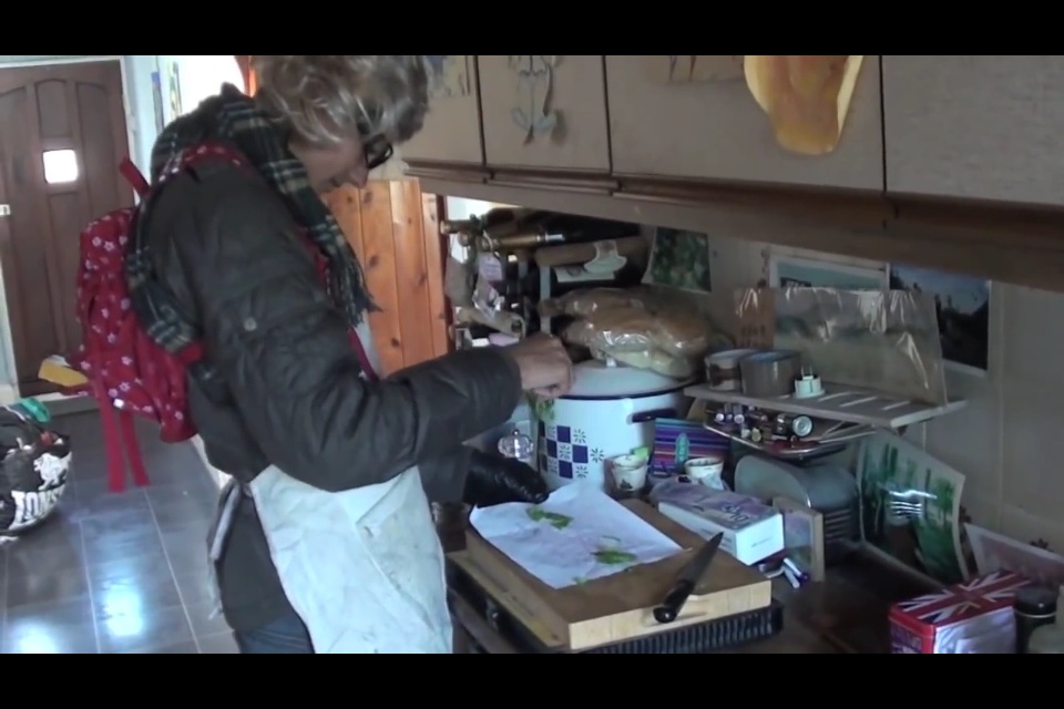 ピーターお料理中。紙に何かの葉っぱをまぶして塩胡椒してオーブンで焼くつもりらしい。